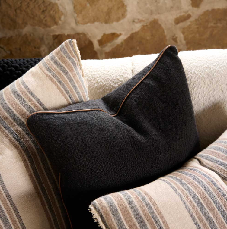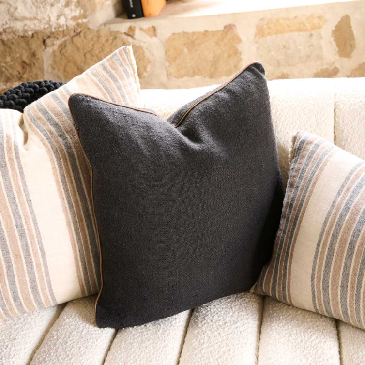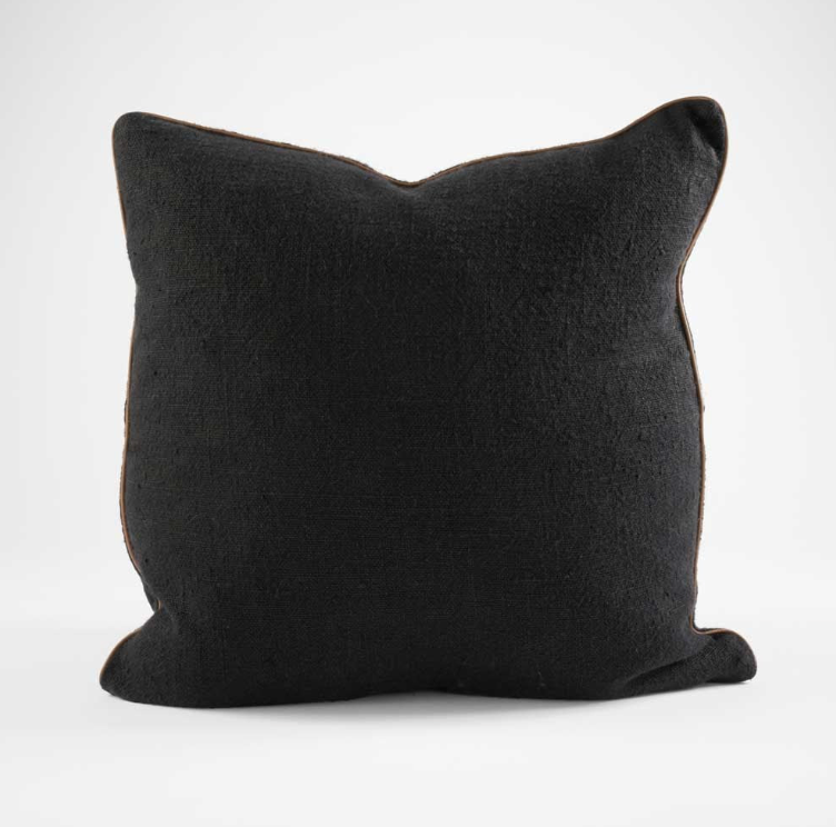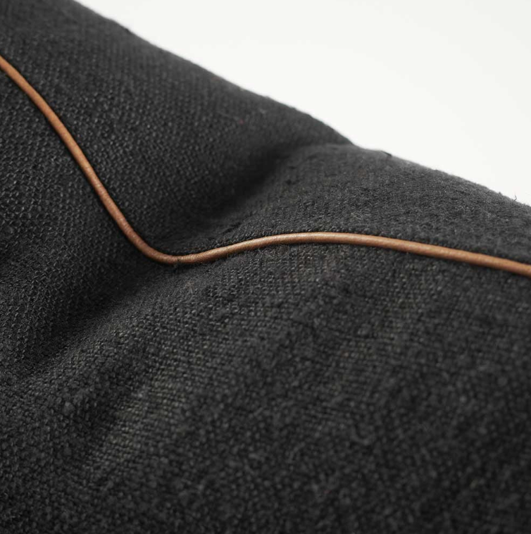 Black Linen Cushion, heavy weight linen with a refined leather piping. Hand woven by artisans using the ancient art of hand looming, this effortless yet elevated design is a superb addition to any space.