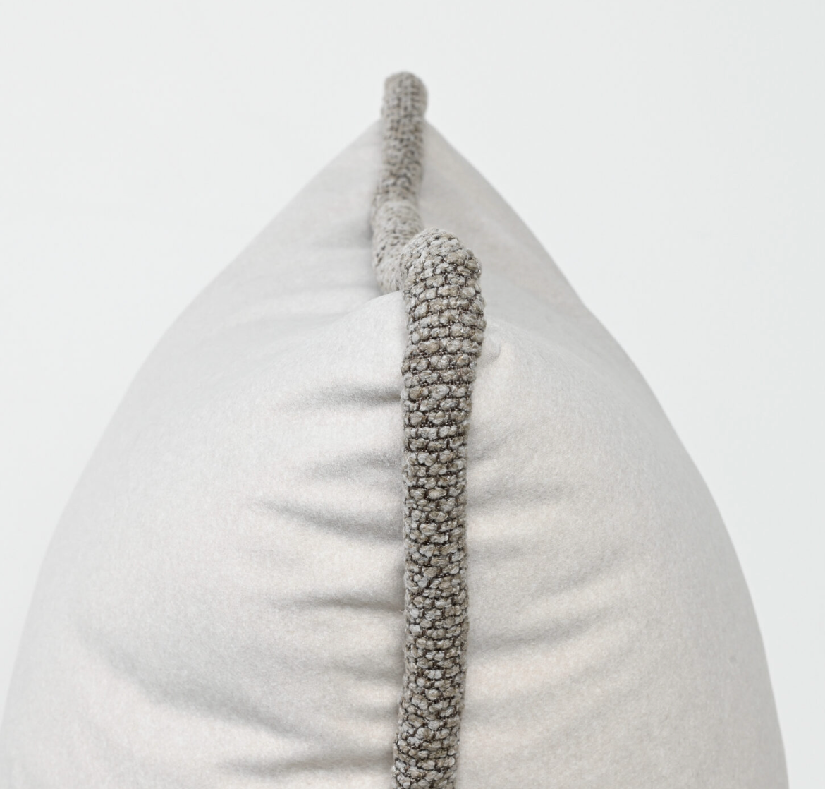 This beautiful cushion has a soft mohair or felt feel fabric on both sides, with a thick woven cappuccino coloured trim. The cushion exudes a simple elegance which will be equally comfortable in a formal or relaxed setting, and easy to pair with other natural tones. As with all our cushions, it includes our signature generous feather fill and is available in a square and rectangular shape.