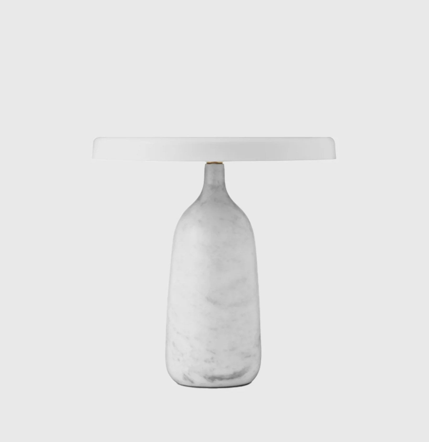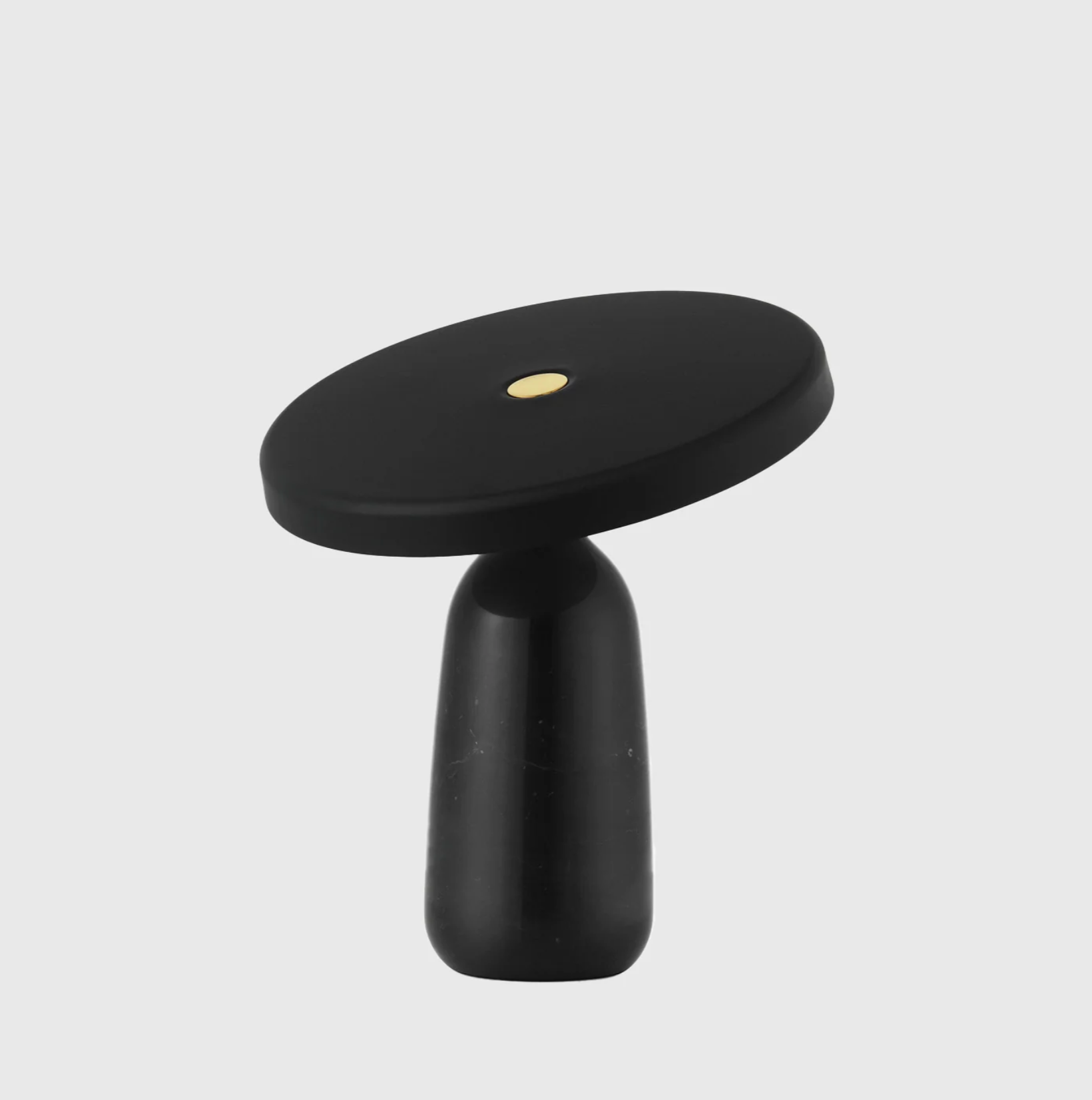 Eddy Table Lamp is an art of proportion: an airy shade floats above a weighty, organic base, creating a design in balance and motion. Steel and marble make up the main elements while golden shimmers of brass add atmosphere.