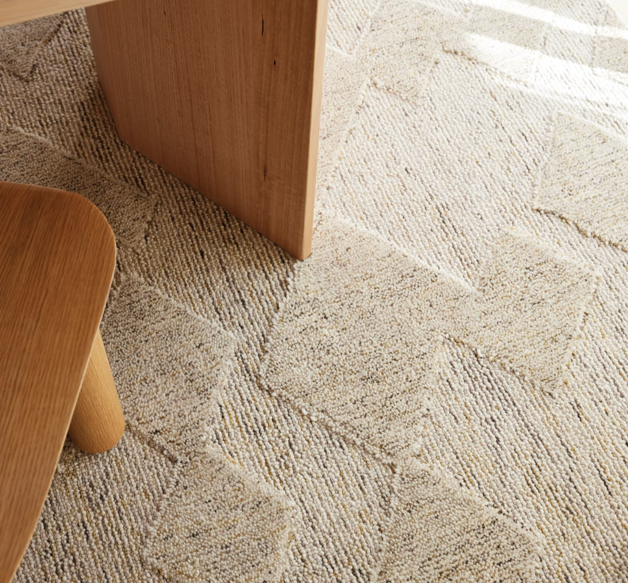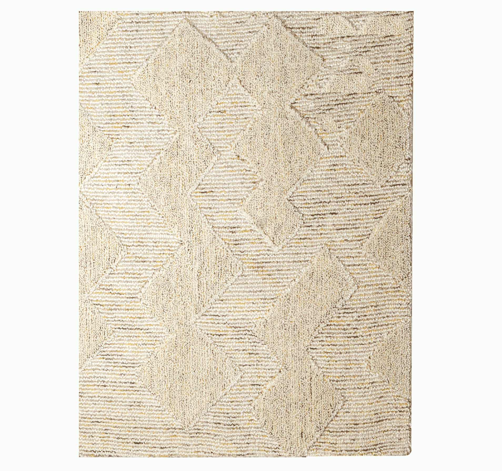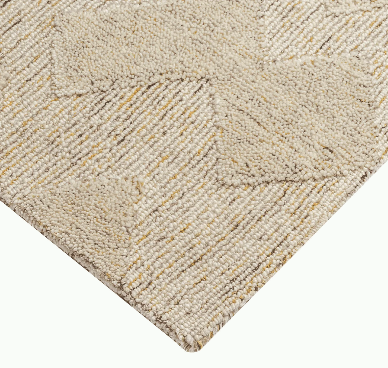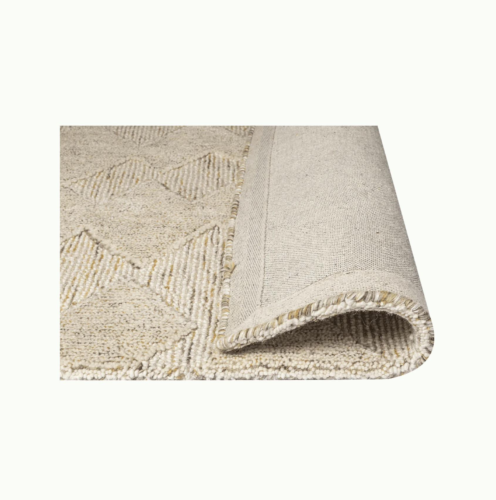A fusion of muted colours, textures and design come together seamlessly to form our hand-tufted rug. This imperfectly, geometric design embraces a warm ivory base, with tones of mustard and mushroom enhancing its high-low design, made further distinguishable by a delicate mix of looped and cut pile.