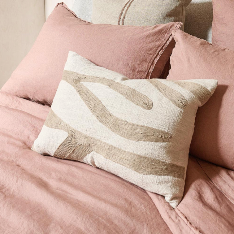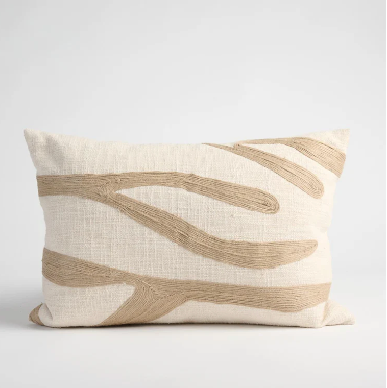 This Cushion is inspired by Kangaroo Paw, a native Australian flower. The jute line work is intricately hand embroidered to replicate the abstract shape of the Kangaroo Paw stems that you see in gardens around Australia. The captivating pattern & tonal colour palette makes this cushion a subtle & modern work of art.