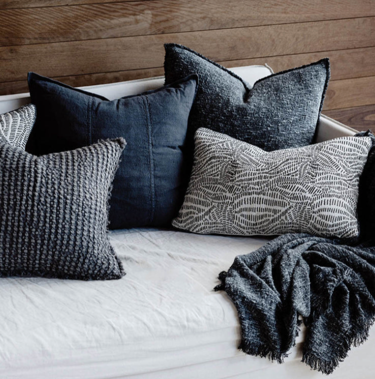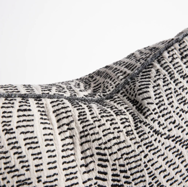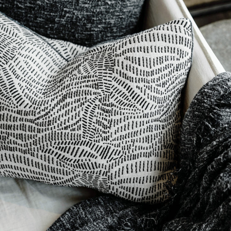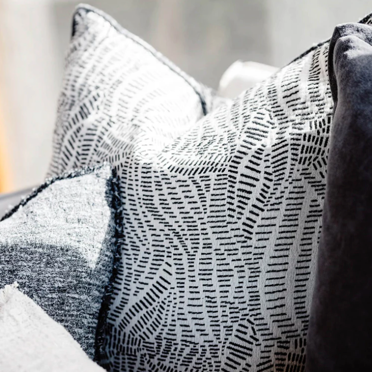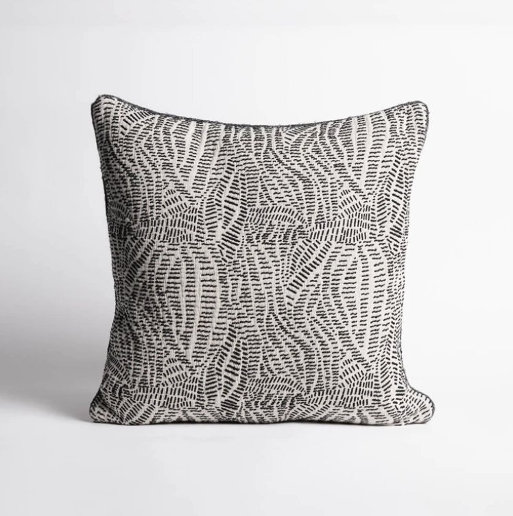 Create a harmonious home with this Cushion. It features a striking jacquard pattern in black yarn that mimics the beauty of midnight, complemented by crisp off-white cotton and sophisticated Sora fabric piping.